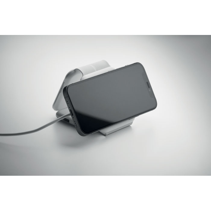 Magnetinė įkrovimo stotelė iš ABS plastiko. 3 belaidžio įkrovimo vietos: 1 x 15W, 1 x 5W TWS ausinėms ir 1 Apple Watch įkroviklis (3W). 2 Type-C ir 2 USB-A jungtys. Integruotas kabelio įvesties lizdas: jungtis iš Type-C į USB-A.